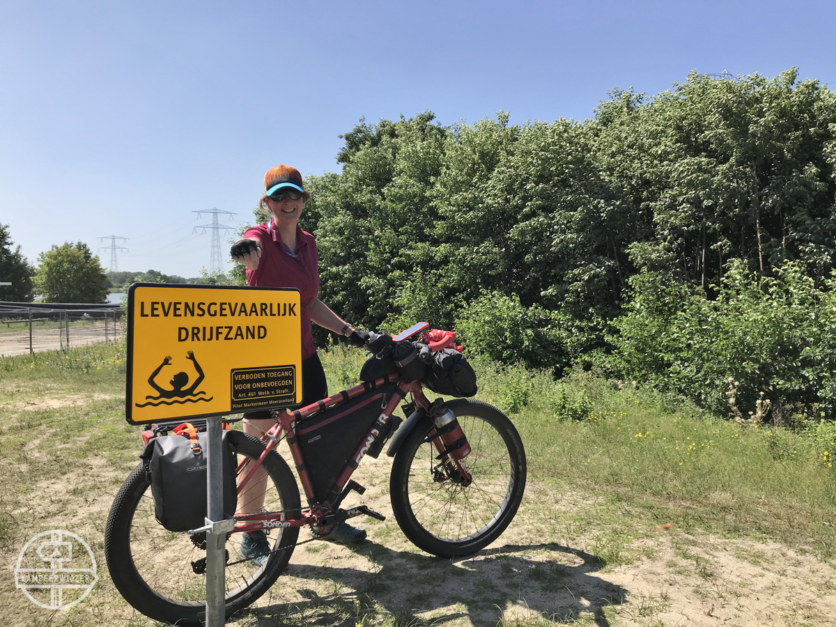 drijfzand Gepubliceerd 30/05/2021 at 1200 × 900 in Risico’s Drijfzand Belle met fiets bij bord dat waarschuwt voor drijfzand