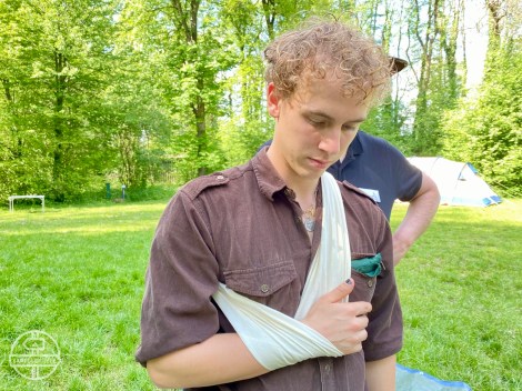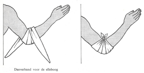 Voor letsel aan de arm of het sleutelbeen kan je een mitella maken of een brede das, maar dit draagverband draagt het prettigste: