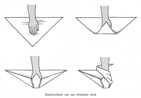 Doekverbanden en dasverbanden maak je van een driekante doek. Een driekante doek 3x opvouwen = brede das.