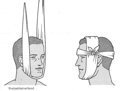 Bij een bloeding aan de slaap kan een zogeheten postpakket doekverband aangebracht worden: