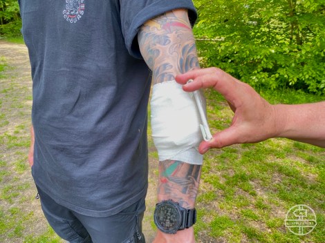 Een traumazwachtel of Israelisch verband breng je aan met sticker boven wond wond. Door plastic ding halen en de andere kant op aantrekken. Vervolgens zigzag kruislings aanbrengen. Kun je gebruiken voor een wond op elke plek op het lichaam. Zelfs nek of sleutelbeen.