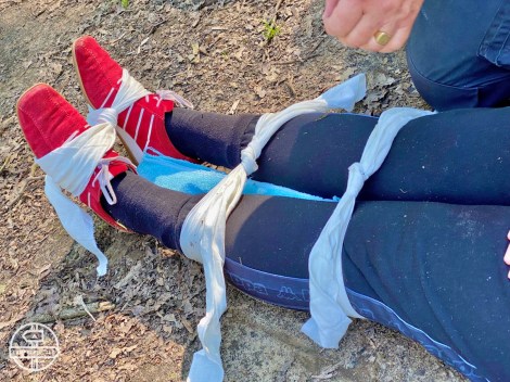 Met behulp van een takje kan je dassen onder de enkel en knie door duwen. Daarna maak je een zaagbeweging om onder de knie uit te komen. Leg een opgerolde handdoek tussen de benen. Beweeg het gezonde been naar gebroken been.