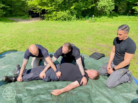 Tourniquet aanbrengen 5 tot 8 cm boven de wond of zo hoog mogelijk. Draai deze 2 tot 3 keer om. Zet de tijd erop. Geen schade als de tourniquet maximaal 1,5 tot 2 uur is aangebracht. Zit deze langer dan 6-8 uur, dan verliest het slachtoffer diens ledemaat. Je kan wel elke 1,5 uur wat bloed toelaten voor je deze weer afknelt. Dit is een afweging, afhankelijk van het bloedverlies.