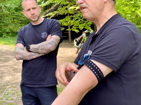 Geen tourniquet? Een broekriem kan ikn nood gebruikt worden om het bloedverlies in elk geval te vertragen. Gebruik geen touw, scheur een t-shirt in repen. Een smalle das van een driekante doek met een halve knoop boven de wond aanbrengen. Vervolgens een haring of stokje erin, drie keer draaien en de knevel vastknopen met een platte knoop.