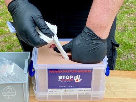 Indien een tourniquet niet mogelijk is: Stop de wond op met hydrofiel zwachtel terwijl je de ader dichthoudt. Eerst overtollig bloed uit de wond scheppen met twee vingers. Daarna wond volproppen. Vervolgens druk uitoefenen op wond.