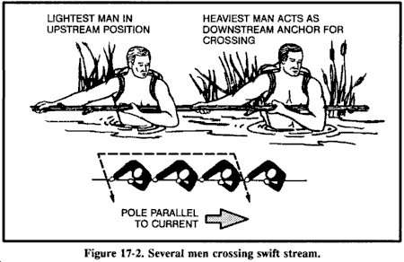 Let op: touw wordt ook meegesleurd door de stroming en bij sterke stroming mensen zelfs onderuit trekken. Ook kan je verstrengeld raken in het touw. Ieder jaar verdrinken er mensen bij het oversteken van rivieren. Het veiligste is om niet over te steken als het water hoger staat dan je knieën. Zoek het dan stroomopwaarts, naar een omgevallen boom die gebruikt kan worden als brug. Vind je geen omgevallen boom, dan loop je bergopwaarts in elk geval naar de plek waar het water minder breed wordt.