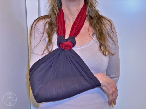 - mitella (eventueel ook op te lossen met extra T-shirt of Buffs);
