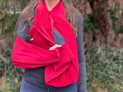 Probeer dit eerst thuis uit want niet elk type Buff heeft de juiste stretch hiervoor. Voor de foto zijn twee wollen Buffs gebruikt. Er is genoeg ruimte om ook de hand nog in de Buff te laten rusten. Op vakantie heb ik meestal een UV- en insectwerende Buff en een warmere Buff bij me.
