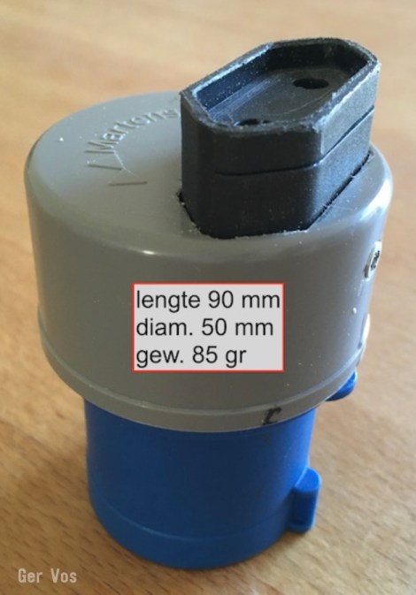 Deze CEE-adapter weegt 144 gram, en meet 12 centimeter bij een doorsneede van 6,5 cm. Dit zijn stekkers om je boot, caravan en camper met de wal te verbinden en zijn onnodig zwaar voor fietsers en wandelaars die rondtrekken met tent en die alleen hun telefoon willen opladen en misschien een e-book. Wie handig is, zoals Ger Vos, knutselt zelf een compactere adapter in elkaar, dat wellicht met wat giethars nog aardig waterdicht gemaakt kan worden.
