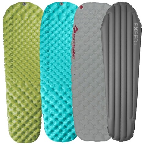 V.l.n.r Sea To Summit Comfort Light Insulated (groen), idem Women’s (aqua), Ether Light XT Insulated (grijs), Exped Winterlite (donkergrijs).