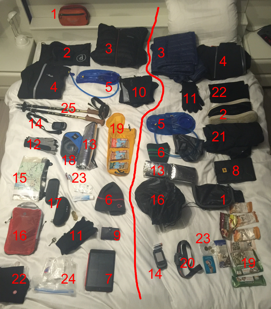 - Losse spulletjes die in de zakjes op heupband zitten: reserve pennlite batterijen voor GPS, aspirine, Bepanthén (schrale lippen), losgeld, huissleutel