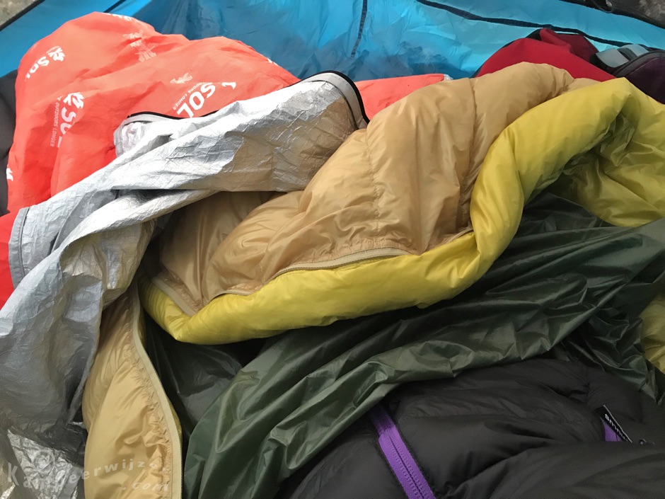 De bivakzak beschermt je slaapzak van buiten tegen condens en voegt een extra laagje isolatie toe. De aluminium laag aan de binnenkant van mijn SOL bivakzak straalt de warmte terug naar je lichaam. Je moet wel oppassen dat je eigen ademhaling niet condenseert tegen de binnenkant van je bivakzak.