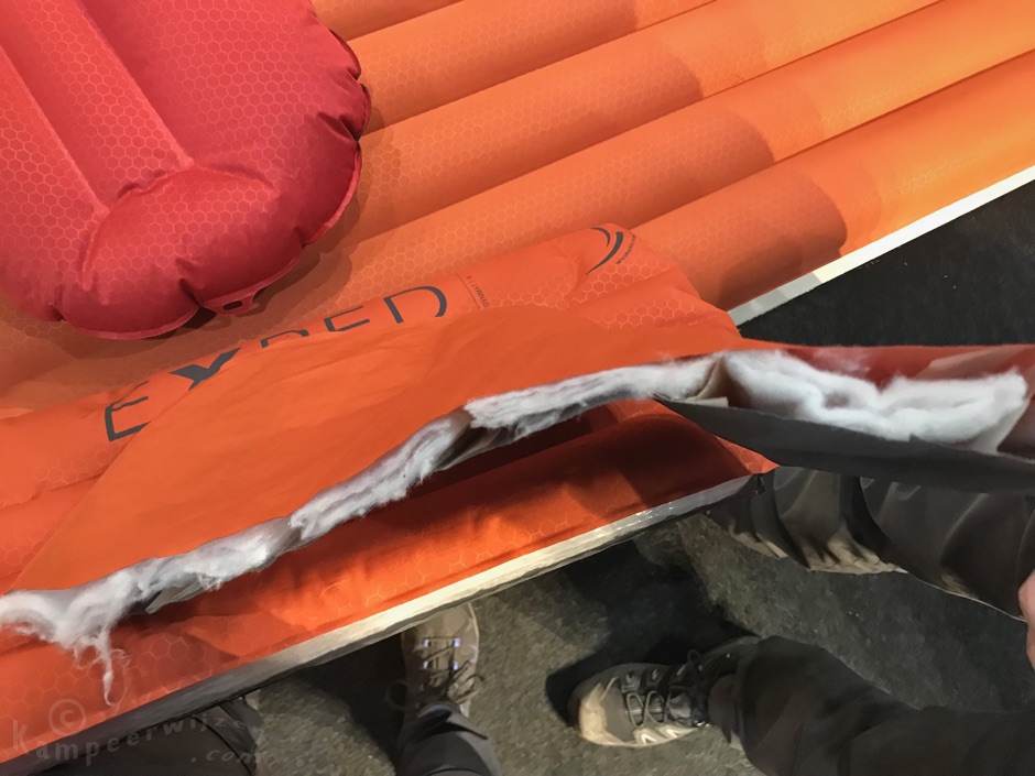 Toen de eerste met dons geïsoleerde luchtbedden op de markt kwamen, isoleerden deze drie keer beter dan de T-a-R self-inflatables die op dat moment de markt domineerden. Exped maakte deze, de Downmat 9, waarbij de 9 stond voor de dikte in centimeters. Hoewel een Zwitsers merk, waren ze in de Verenigde Staten een stuk betaalbaarder dan in Europa en kocht ik mijn eerste Exped in de VS in 1994. Overigens had Dave in het Amerikaanse leger al in de jaren ’80 een met dons gevuld luchtbed. Die bliezen ze echter nooit op, teveel gedoe voor 2 uur slaap en niet nodig als je niet op een camping slaapt waar de grond platgetreden en hard is.