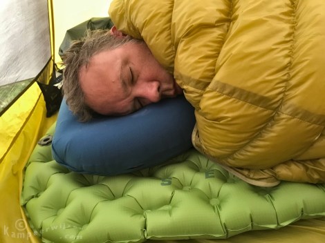 De naad van mijn mat sprong om 21.30 uur, 10 minuten nadat ik er net genoeg lucht in had gedaan om erop te kunnen slapen. De mat is dan niet eens hard. Bij Dave sprong de mat ’s ochtends heel vroeg voor zonsopgang, op het koudste moment van de dag. Wat dat betreft is het veiliger om op lange reizen te vertrouwen op een EVA foam mat, een self-inflating mat of de Exped TT-mat, met vervangbare individuele luchtbuizen. Want vind maar eens een nieuwe mat onderweg (alleen in grotere steden) of regel de garantie – not). De Exped TT-mat is overigens veel te zwaar voor bike- en backpackers.