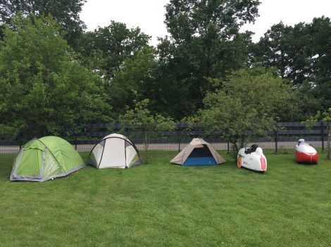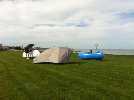 De meeste ruimte op/in de fiets wordt tijdens een kampeervakantie in beslag genomen door de tent en slaapzak. Van alle uitrustingsstukken weegt het meestal het meeste. Voor een fietsvakantie werd vroeger voor de tent een basisgewicht aangehouden van 2,5 kg plus 1,5 kg per persoon. Dus 5,5 kg voor twee personen. Dat vinden we tegenwoordig erg zwaar, en gelukkig kan tegenwoordig veel lichter. Onze vorige tweepersoonstent (Sierra Designs Lightning 2) woog 1,76 kilo, de huidige weegt 801 gram (Zpacks Triplex). Lichtgewichtkampeerders gaan uit van een kilo per persoon, dus twee kilo voor een tweepersoonstent. Maar er zijn ook tweepersoons tenten te vinden die minder dan een kilo wegen. Je moet wel opletten of in het opgegeven gewicht zijn inbegrepen: stokken, haringen, het foudraal, evt. grondzeil en bij ultralichtgewicht tenten de binnentent. Zitten er tentstokken bij of wordt ervan uitgegaan dat je wandelstokken bij je hebt?