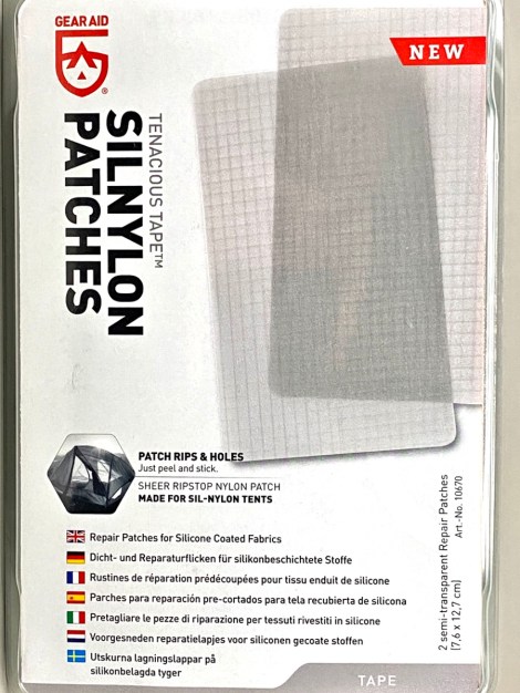 Voor sil-nylon doek hebben we van Gear Aid Tenacious Tape silnylon patches bij ons. Deze kunnen op maat geknipt worden, hoekjes afronden en dan plakken op de met siliconen gecoate stof. Het is ook te gebruiken op tal van andere stoffen.