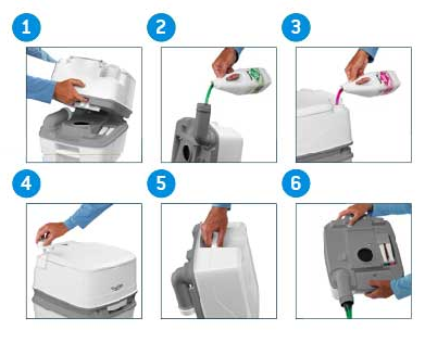 Een Porta Potti compact chemisch toilet bestaat uit twee gedeelten: het bovenste gedeelte is een gecombineerde spoelwatertank en toiletpot met een afneembare bril en een afneembaar deksel. Het onderste gedeelte is de afvaltank.