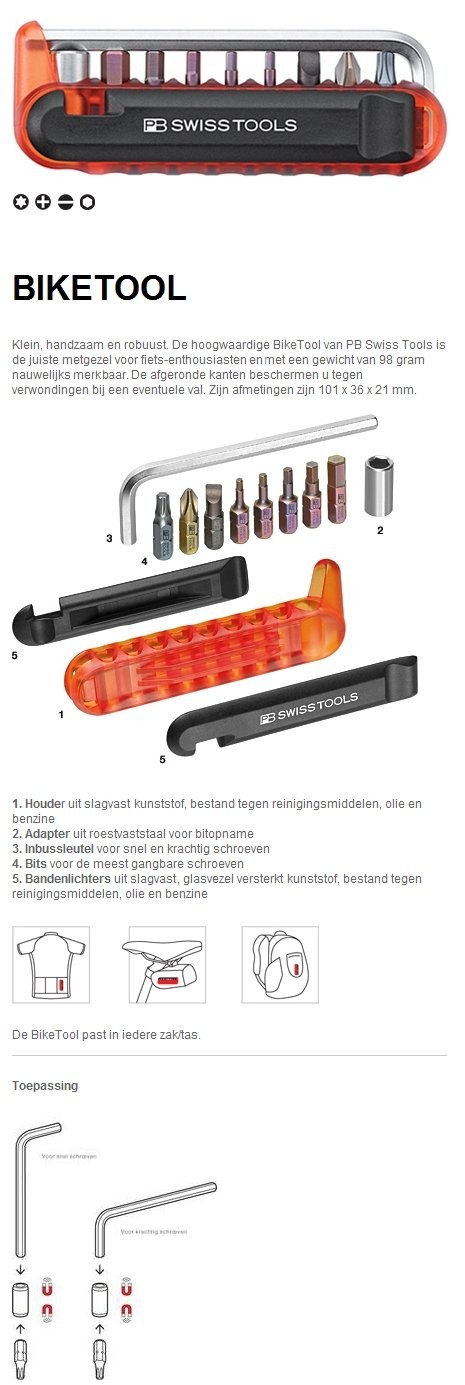 De PB BikeTool komt natuurlijk óók niet met alle juiste bitjes, maar die kun je voor 2 à 3 euro per stuk los bijbestellen en dan schuif je de juiste bitjes erin (en de verkeerde eruit). De houder zelf is al een inbus 5, dus die hoeft niet mee als bitje. In totaal zit in dit compacte setje dus 9 schroevendraaiers (eventueel 10 als je in de houder nog een inbus 8 meeneemt). Wij bestelden de bitjes los bij gereedschapwinkel Hugo Schipper (in 2022 samengegaan met Van Opzeeland Techniek bv).