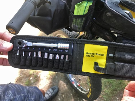 De Go SwissDrive motor zit dichtgedraaid met torx 20, maar we gaan ervan uit dat we daar onderweg niet zelf aan gaan sleutelen. Het bleed systeem van de remmen heeft torx 15 maar we nemen ook geen minerale olie, spuit en slang mee. Belle’s SPD-pedalen kan je losdraaien met een inbussleutel 6 òf steeksleutel 15. De 6 wordt ook gebruikt om de binnenkant van de schakelhendels los te halen. Dave’s Eggbeater-pedalen van Crankbrothers gaan alleen los met inbussleutel 8.