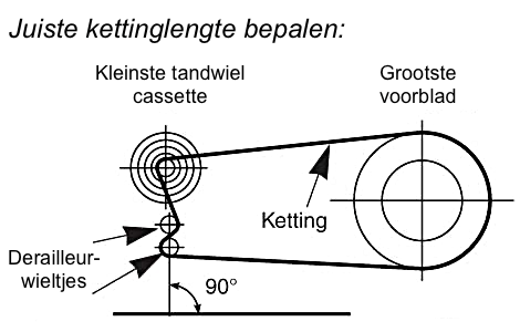 Het bepalen van de juiste kettinglengte doe je met de ketting op het kleinste tandwiel en grootste tandblad. De derailleurwieltjes moeten dan recht onder elkaar staan als het goed is. Staat de derailleur richting de 7 in de klok, dan is de ketting te lang en richting de 5 te kort. Voor ligfietsen kan een andere stand als optimaal gelden (derailleur tussen 7 en 8).