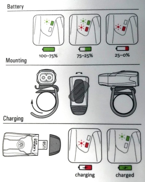De door de fabrikant opgegeven brandduur dient met een grote korrel zout genomen te worden. Waarschijnlijk is dat alleen geldig onder ideale omstandigheden maar niet de omstandigheden waarin je de lamp nodig hebt in het veld: in de regen en de kou. In plaats van de opgegeven 12 à 13 uur doen deze lampjes het bij ons ongeveer vier uur in de ‘flash 2’ stand. Dat is dus te kort voor de gemiddelde dagtocht tijdens een fietsvakantie. Ook onhandig is dat de economische stand bij deze lampjes voor de voorlamp de vijfde optie is en voor het achterlicht de vierde. Oplaadbare batterijen verliezen snel capaciteit als ze ouder worden.