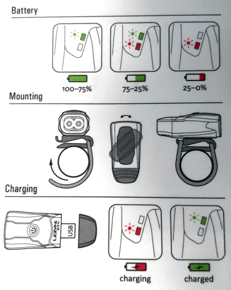 De door de fabrikant opgegeven brandduur dient met een grote korrel zout genomen te worden. Waarschijnlijk is dat alleen geldig onder ideale omstandigheden maar niet de omstandigheden waarin je de lamp nodig hebt in het veld: in de regen en de kou. In plaats van de opgegeven 12 à 13 uur doen deze lampjes het bij ons ongeveer vier uur in de ‘flash 2’ stand. Dat is dus te kort voor de gemiddelde dagtocht tijdens een fietsvakantie. Ook onhandig is dat de economische stand bij deze lampjes voor de voorlamp de vijfde optie is en voor het achterlicht de vierde. Oplaadbare batterijen verliezen snel capaciteit als ze ouder worden.