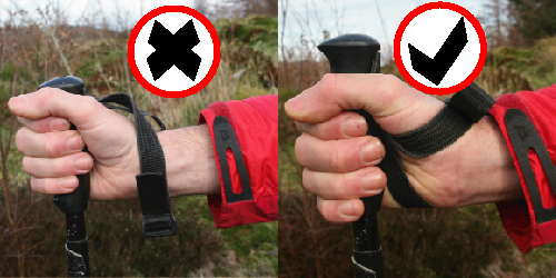 De lussen laat je naar beneden hangen en dan grijp je van onder door de naar beneden hangende lus het handvat. Op deze manier blijft de stok aan je hand hangen als je deze bewust loslaat maar is het veiliger bij een val. Er zijn ook scholen die stellen dat je nooit de polsbanden moet gebruiken omdat dit de kans dat je je pols breekt bij een val vergroot. Als je de lussen echter niet gebruikt, kan je nooit een goede ‘zwiep’ naar voren maken met het lopen.
