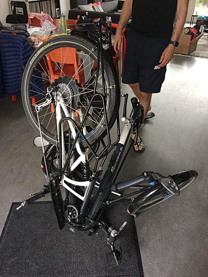 Opvouwen is gedoe. Uiteindelijk kochten we een Volkswagen Caddy Maxi, hierin konden we de twee trikes achterin de auto vervoeren.